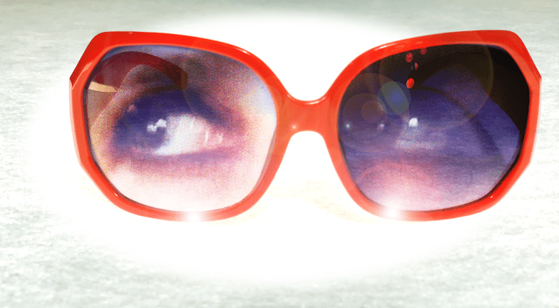 As if in a futuristic department store or sci fi opticians, sunglasses, with blinking eyes and personalities inside, are picked up and set down on an illuminated display.